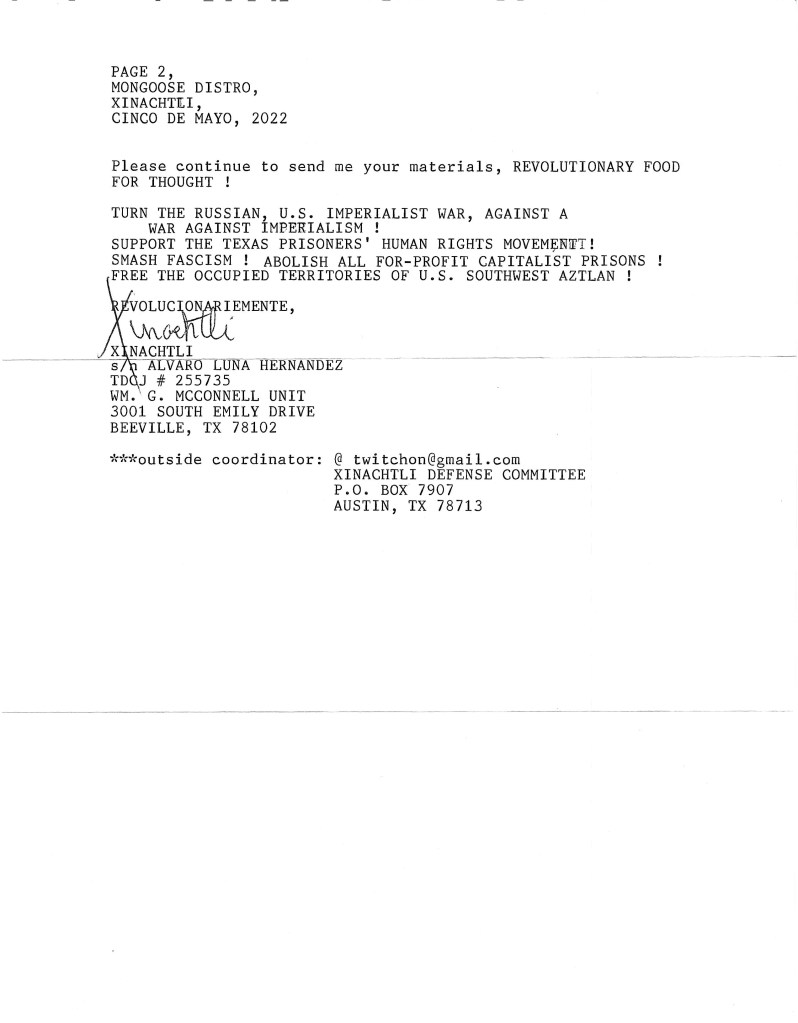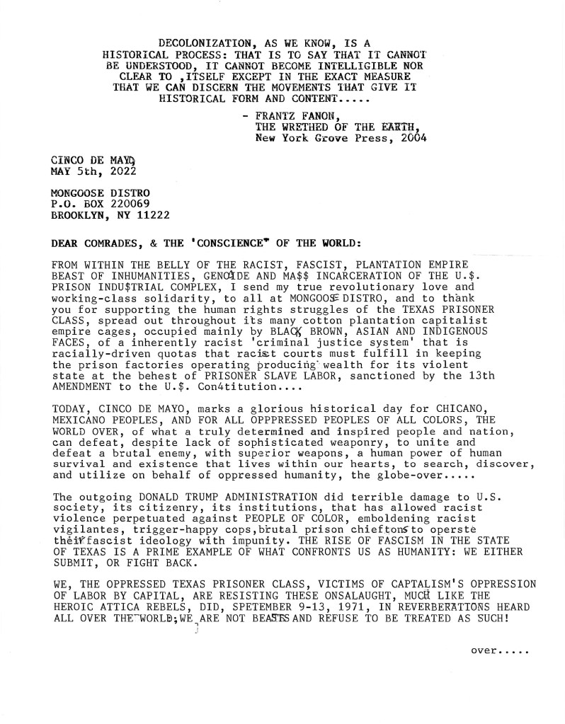 Cinco De Mayo Message from Xinachtli Posted bymongoosedistroMay 9, 2022Posted inUncategorized xinachtli-cinco-de-mayoDownload Share this: Click to share on X (Opens in new window) X Click to share on Facebook (Opens in new window) Facebook Like Loading... Related Published by mongoosedistro "Contains material solely for the purpose of achieving breakdown of prison through disruption" -Texas Dept. of Criminal Justice mailroom View more posts
