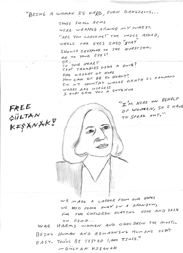 Today I started my hunger strike. Yesterday I was attacked by a white Christian Nationalist trump supporter, who was put in my SHU cell in spite of my protests. Despite my injuries I am full of determination, bloodied but unbroken. But, this is a small amount of suffering compared to friends like Gultan Kisanak, a Kurdish woman and political prisoner. I drew her portrait and wrote some of her quotes. Every day of my hunger strike I will draw a Kurdish woman who is a political prisoner and send her inspiring words to different friends. I ask that you all post them all online for me to raise awareness.
