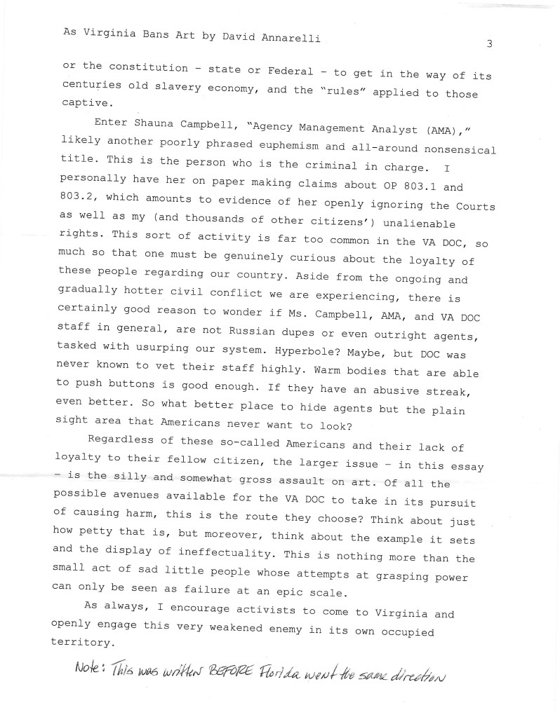 As Virginia Bans Art – by David Annarelli Posted bymongoosedistroOctober 9, 2023Posted inUncategorized Share this: Click to share on X (Opens in new window) X Click to share on Facebook (Opens in new window) Facebook Like Loading... Related Published by mongoosedistro "Contains material solely for the purpose of achieving breakdown of prison through disruption" -Texas Dept. of Criminal Justice mailroom View more posts