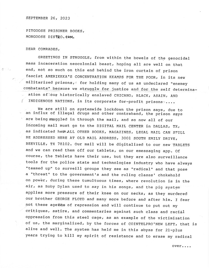 Message from Anarchist Political Prisoner Xinachtli (9/26/23) Posted bymongoosedistroOctober 23, 2023Posted inUncategorized xinachtli-9-26-23Download Share this: Click to share on X (Opens in new window) X Click to share on Facebook (Opens in new window) Facebook Like Loading... Related Published by mongoosedistro "Contains material solely for the purpose of achieving breakdown of prison through disruption" -Texas Dept. of Criminal Justice mailroom View more posts